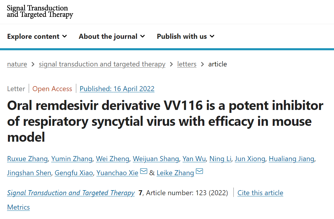 北京时间2022年4月16日,Nature旗下刊物《信号转导和靶向治疗》(Signal Transduction and Targeted Therapy,STTT,IF:18.187)在线发表了口服核苷类抗SARS-CoV-2药物VV116(JT001)作为潜在呼吸道合胞病毒(RSV)抑制剂的临床前体内药效研究成果。