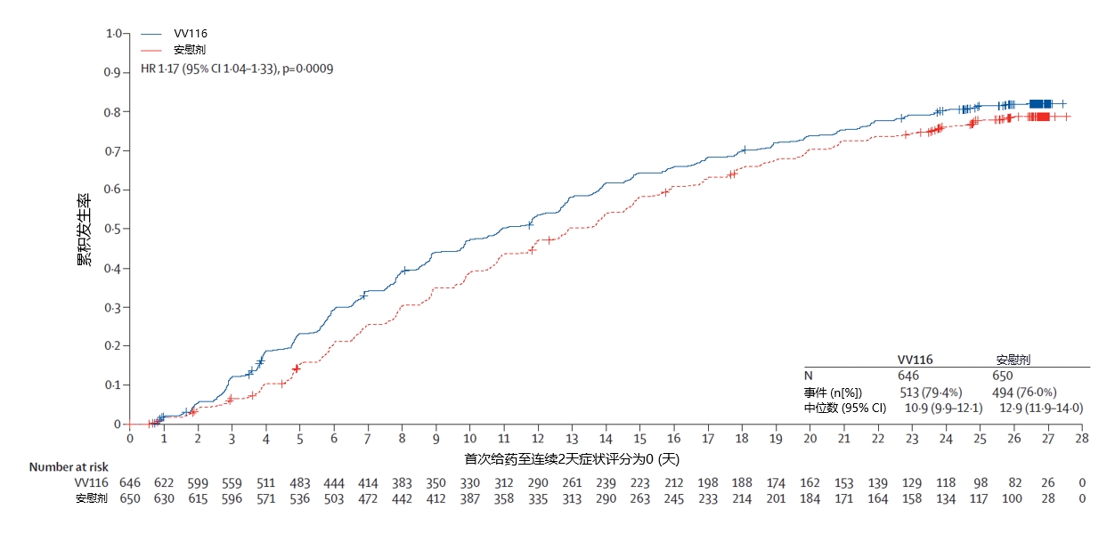 該研究在期中分析階段即已獲得具有統計學意義和臨床意義的顯著結果,與安慰劑相比,民得維®治療輕、中度新冠病毒感染成人患者(≥18歲)可顯著縮短咳嗽、流涕、發熱、腹瀉等11項臨床症狀的消失時間,中位時間比安慰劑組縮短2天(HR=1.21,P=0.0023)。最終分析結果與期中分析一致,症狀消失中位時間比安慰劑組縮短2天(HR=1.17,P=0.0009),為國內外新冠口服藥已報導資料中表現最優,進一步證明了民得維®的療效獲益。60歲以上老年患者的亞組分析資料與整體人群一致。